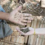 Na atividade do dia seguinte, que aconteceu no quintal do Goethe, Lotufo levou cal, areia, argila e pigmentos naturais como o açafrão para mostrar algumas variedades de materiais de construção simples e de baixo impacto ambiental. “Quando a técnica e o material são acessíveis e hackeáveis, a comunidade pode acumular poder através do conhecimento, pois vai se apropriar e melhorar aquilo, criar sua própria estética, que é a linguagem do fazer junto, do mutirão”, ensinou. Dali seguimos para um reconhecimento das características do terreno e foi necessário desviar de alguns abacates que caiam com força no chão. Depois, a turma foi dividida em grupos e cada um começou a criar seu projeto para uma área de convivência no quintal. Nesse exercício de ecologia da imaginação, o processo importou mais do que o resultado, até porque uma manhã é muito pouco tempo para uma tarefa imersiva e lenta como essa. A percepção de cada um, com suas experiências e conhecimento adquirido, enriqueceu o resultado. “Todos tem energia para aflorar e é em comunidade que ela nasce”, desvendou Lotufo, enquanto o pessoal se preparava para mostrar seus projetos.